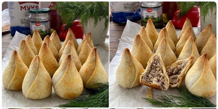 Тесто в пирожках хрустящее, слоистое, вкусное и в них очень много начинки.